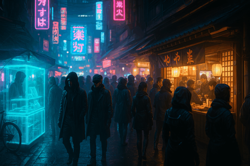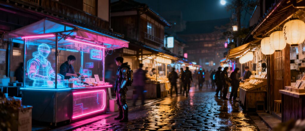 修正後:"Cyberpunk Tokyo night street market with holographic stalls, blue and magenta neon signs, wet air with volumetric light rays, traditional wooden shops mixed with futuristic elements, dense crowd with tech-noir fashion, shallow depth of field"