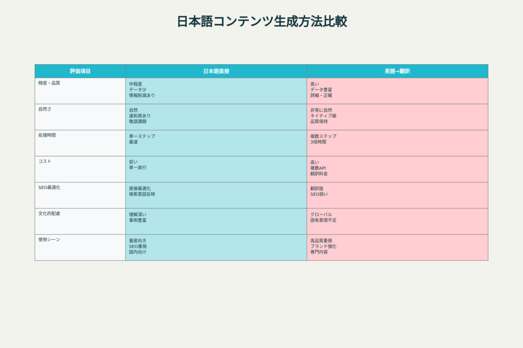 独立系ライフスタイルブログの場合、初期段階ではスピーディな日本語プロンプト直接作成で記事量を確保し、月1-2本の特に重要な記事については英語→翻訳のハイブリッドアプローチを活用することが現実的です。ユーザーの成長段階や経営リソースに応じて、これらのアプローチを柔軟に組み合わせることが成功の鍵となります。​​