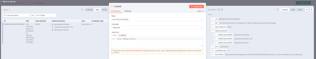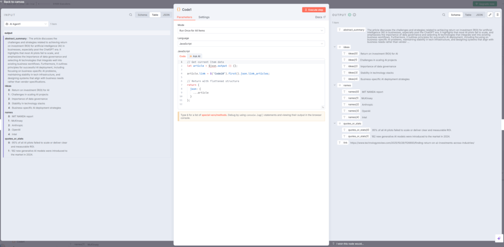 Code1ノードでは、AI Agentから返されたデータを次のステップで使いやすい形式に整形します。このノードでは、元記事のURLや抽出した情報をまとめて一つのオブジェクトとして返す処理が行われています。