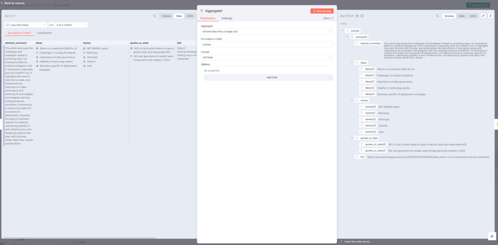 Aggregate1ノードは、Loop Over Itemsで一つずつ処理された記事のデータを全て集めて一つのアイテムにまとめます。このノードでは、「All Item Data Into a Single List」モードを選択し、「Put Output in Field」に「articles」を指定します。