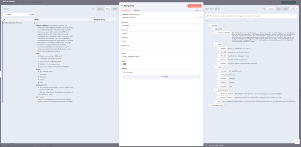 保存されるフィールドには、articles配列とcompleted_step(進行状況を示すフラグ)が含まれます。これにより、ワークフローのどの段階まで処理が完了したかを追跡できます。