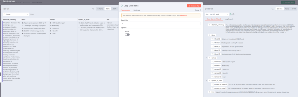 このステップを理解することで、n8nでのAI自動化ワークフローの構築方法がより明確になるはずです。Split Out、Loop Over Items、AI Agent、Structured Output Parserといった重要なノードの使い方をマスターすれば、様々な自動化シナリオに応用できます。