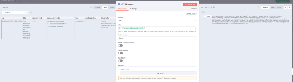 HTTP Requestノードは、記事のURLにアクセスして完全なHTMLコンテンツを取得します。このノードでは、メソッドをGETに設定し、URLフィールドには前のノードから渡された記事リンクを指定します。