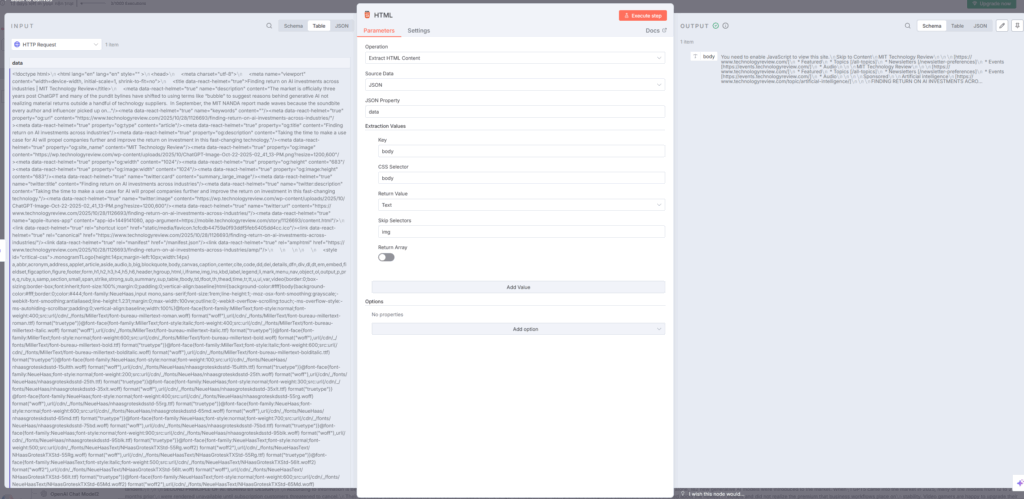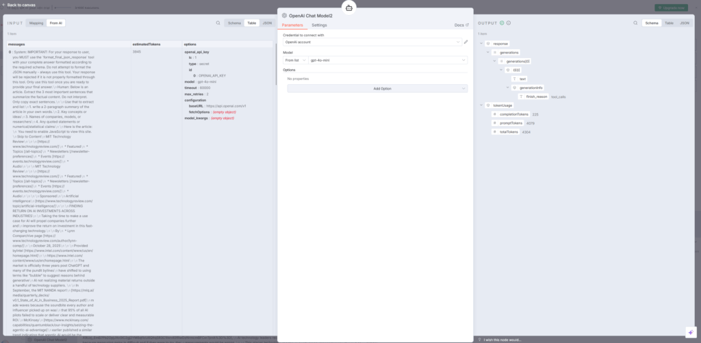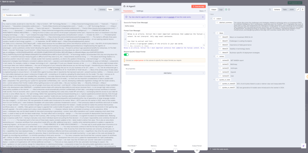 AI Agent1ノードは、ステップ3の最も重要な部分です。このノードでは、OpenAI Chat Modelを使用して記事から以下の情報を抽出します。