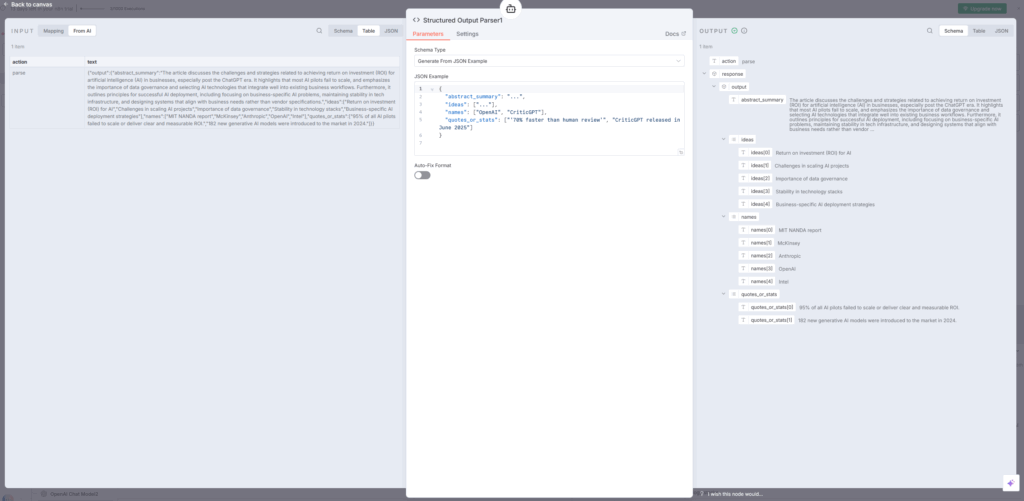 設定画面では、「Generate from JSON Example」または「Define using JSON Schema」のいずれかを選択し、期待する出力形式を定義します。これにより、abstract_summary、ideas、names、quotes_or_statsといったフィールドが明確に分離された形で出力されます。